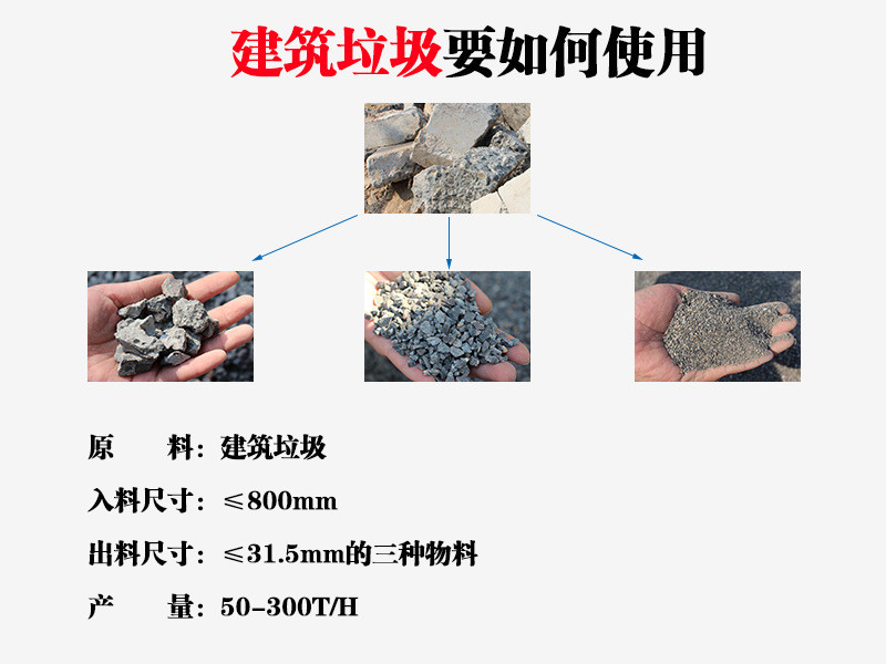 合乎用材规范:历经建筑垃圾处理设备粉碎、筛选、筛分、清理后,可做为再造石料,0-5毫米、5-10毫米、10-15mm、15-30mm…粒型好、品质优;